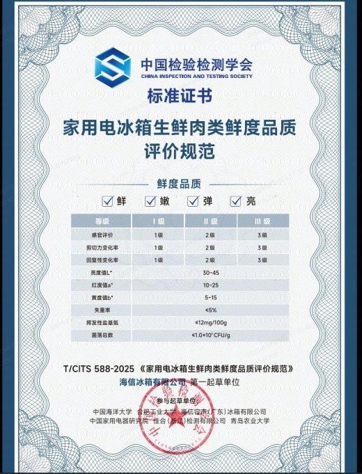 鲁网9月30日讯9月29日,由海信冰箱牵头制定的《家用电冰箱生鲜肉类鲜度品质评价规范》正式通过审定。这一团体标准的建立,首次为冰箱行业的“肉类保鲜”能力构建了一套科学、完整且可量化的评价体系,标志着家用冰箱保鲜技术从长期的概念宣传迈入科学实证的新阶段。